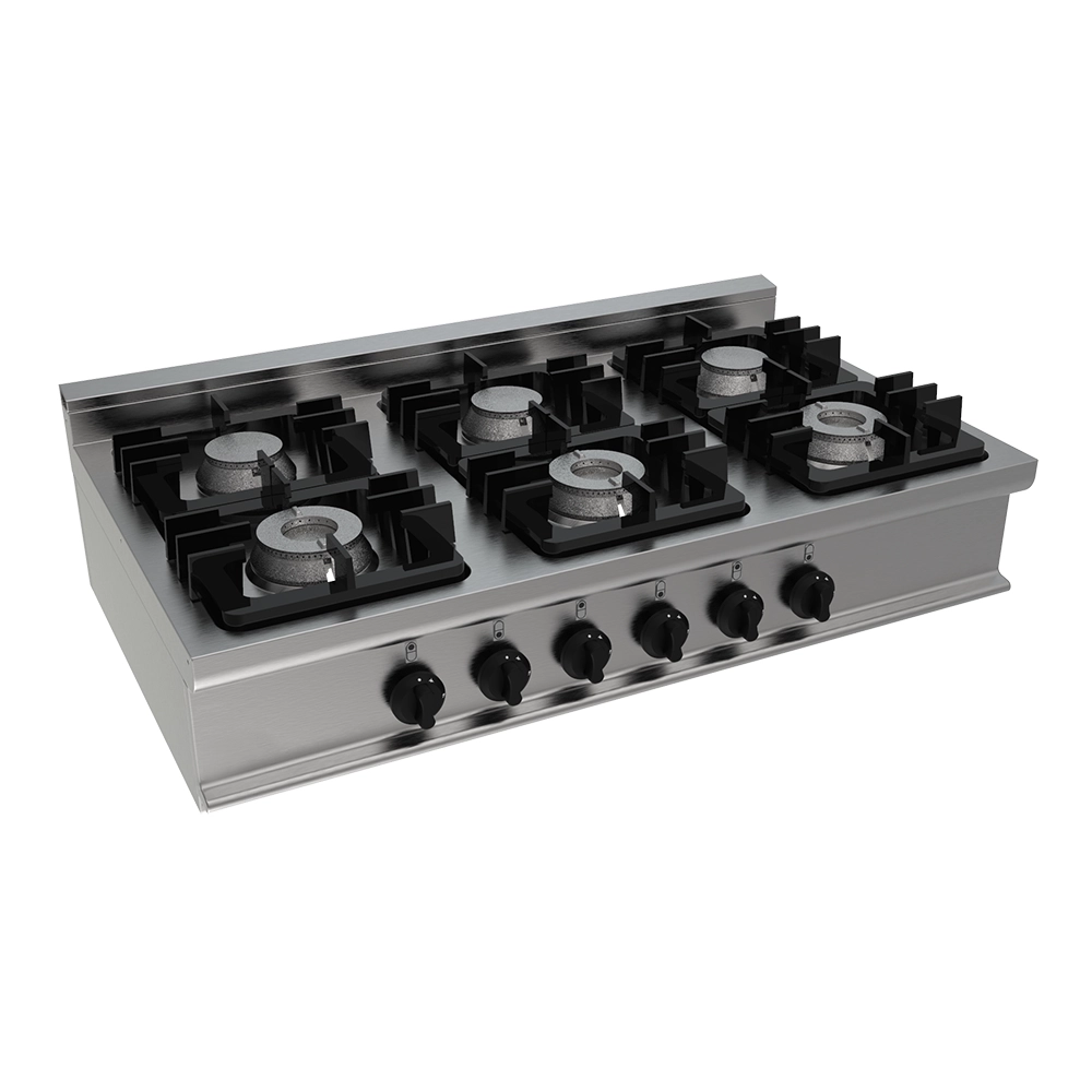 Cucina da banco gas in acciaio inox a sei fuochi ad accensione manuale.
