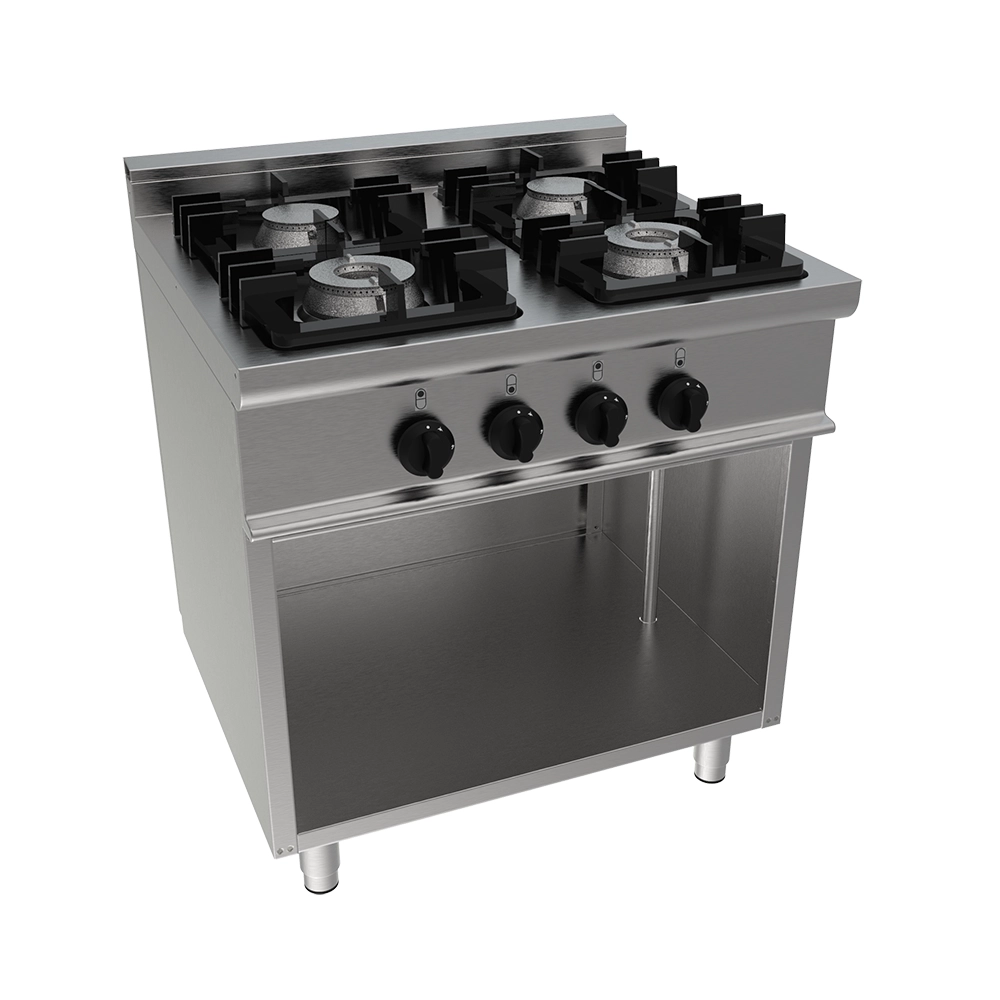 Cucina gas in acciaio inox su vano a giorno a quattro fuochi ad accensione manuale.