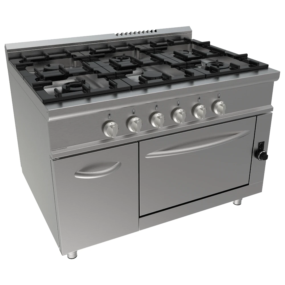 Cucina professionale a gas con forno GN 2/1, progettata per l’utilizzo intensivo in ristoranti, hotel, mense e cucine professionali. La struttura è interamente in acciaio inox AISI 304 scotch brite, sinonimo di robustezza, igiene e lunga durata.