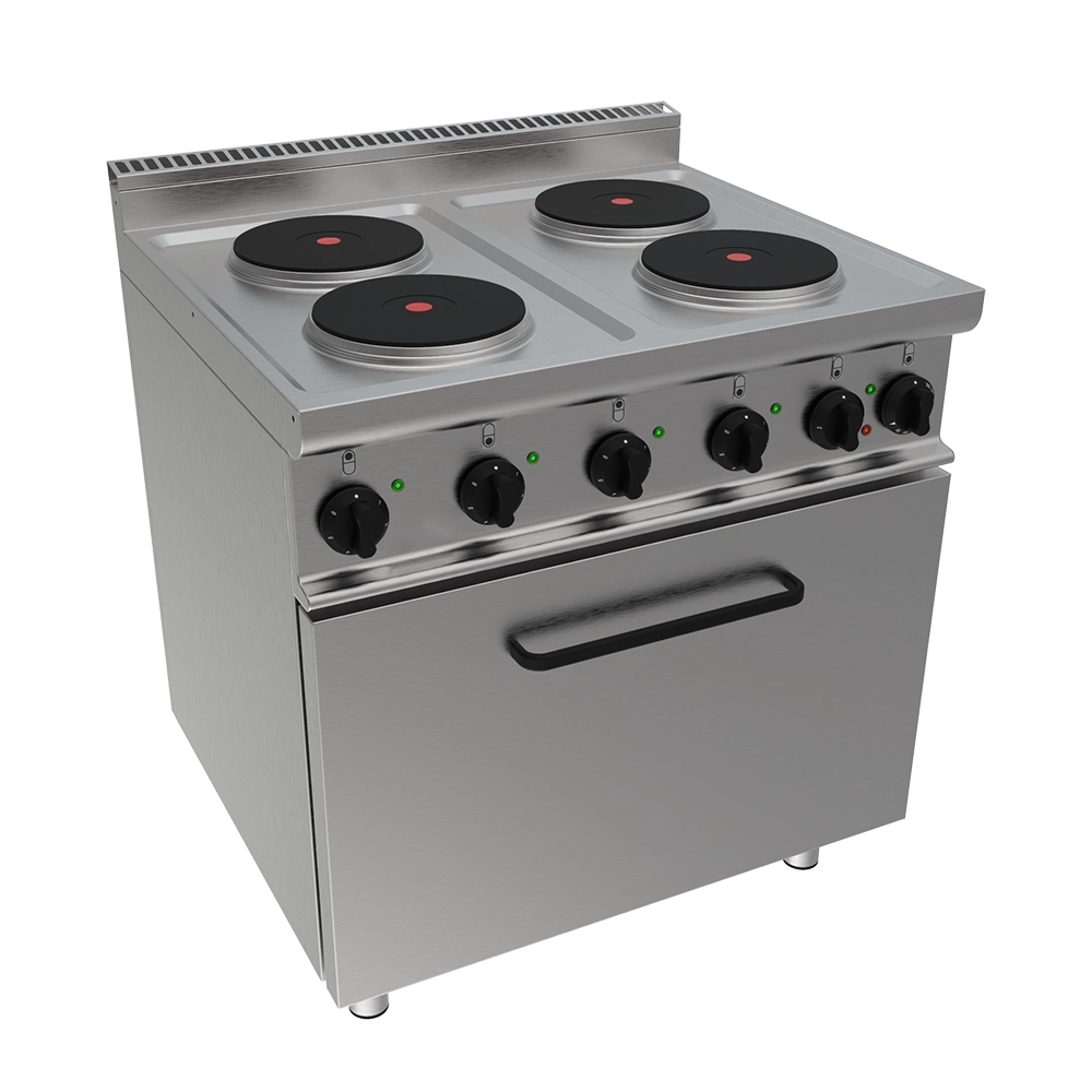 Cucina elettrica con quattro zone di cottura con forno elettrico. Piano superiore in acciaio inox e piastre di cottura in ghisa da 220mm di diametro e 2,6 kW cadauna con dispositivo di protezione termica. Impronta raccogli liquidi. Commutatore di regolazione con sette posizioni. Manopole e maniglie in materiale atermico. Potenza 15,88 kW totali, 400V 3N, intensita’ elettrica 50/60. Piedini regolabili in altezza. Forno elettrico con porta e controporta in acciaio inox, camera di cottura in acciaio inox, studiato per una facile pulizia, dotato di due resistenze corrazzate (cielo e platea) con regolazione indipendente per mezzo di due termostati. Temperatura da 100°c a 300°c. Potenza forno 5,48 kW.