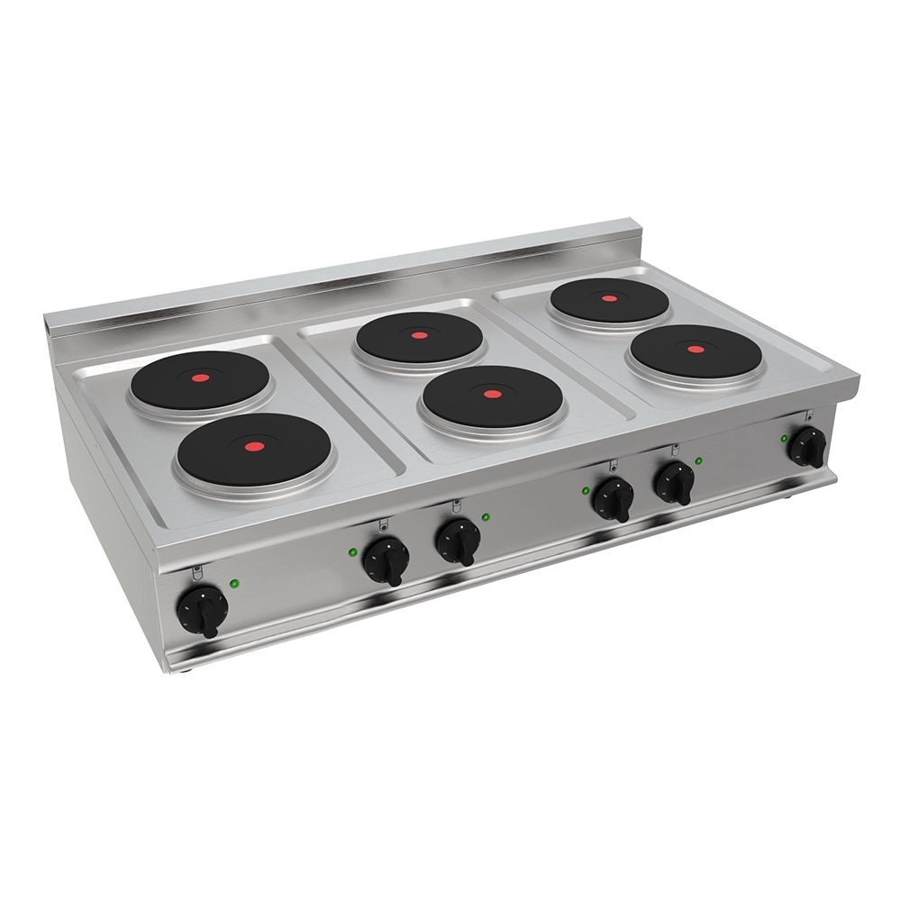 Cucina elettrica con sei zone di cottura con piano superiore in acciaio inox e piastre di cottura in ghisa da 220mm di diametro e 2,6 kW cadauna. Impronta raccogli liquidi. Commutatore di regolazione con sette posizioni. Manopole e maniglie in materiale atermico. Potenza 15,6 kW totali, 400V 3N, intensita’ elettrica 50/60.