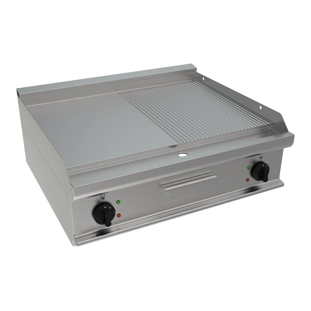 Piastra a gas professionale ideale per ristoranti, gastronomie e cucine industriali. Realizzata in acciaio inox AISI 304, offre massima resistenza e igiene. La piastra 1/2 liscia e 1/2 rigata da 15 mm garantisce una cottura uniforme, mentre le due zone indipendenti permettono di gestire più preparazioni contemporaneamente.