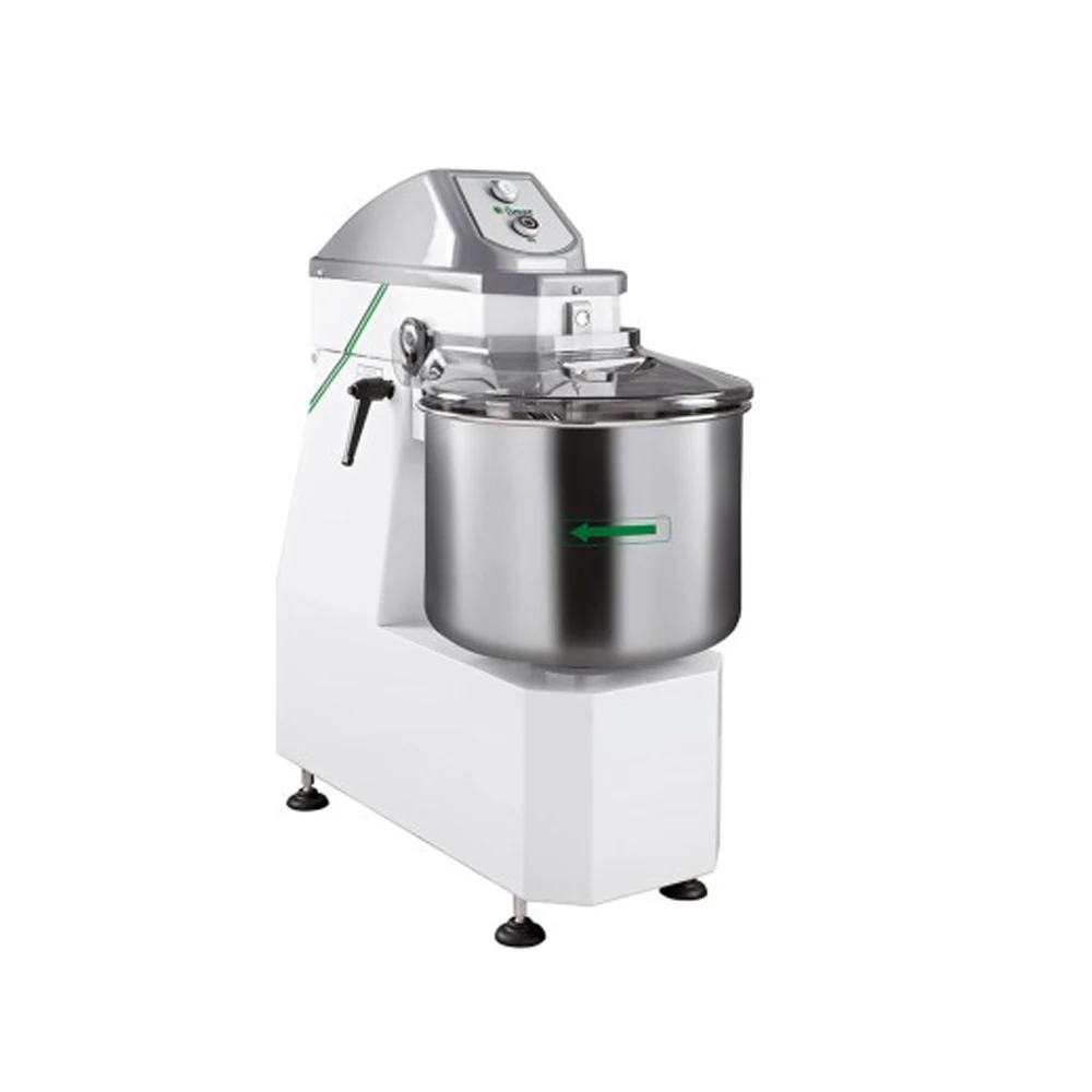 L’impastatrice a spirale 12SL è dotata di testa sollevabile e vasca fissa, soluzione ideale per la preparazione di impasti teneri in panifici, pizzerie e laboratori artigianali. La struttura è rivestita con vernice antigraffio, mentre vasca, spirale e asta spacca pasta sono realizzate in acciaio inox per garantire igiene, durabilità e facilità di pulizia. Il coperchio in policarbonato fumé è fornito di serie, con microinterruttore di sicurezza integrato. Su richiesta sono disponibili optional come il coperchio grigliato in acciaio inox AISI 304. Una macchina affidabile, pensata per garantire risultati costanti e omogenei nel tempo.